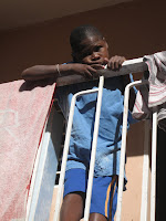 - The Ramp of Death. Each day of classes, we would help take the children with wheelchairs down to the first level. Since the house isn't designed to be wheelchair accessible, the wooden planks on top of the stairs were relatively steep. One of the children, David, would make a special request for me to take him downstairs because he thought the look of fear in my eyes as I wheeled him downstairs backward (using my shins as a brake) absolutely hilarious. *Note the scuff marks on the wall.*